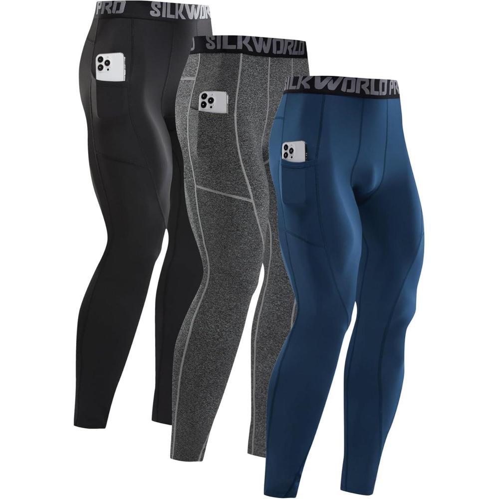 SILKWORLD Men’s 1~3 Pack Compression Pants Pockets Cool Dry Gym Leggings Baselayer Running Tights(C3_fleece Lined_3pack_black white navy Blue)