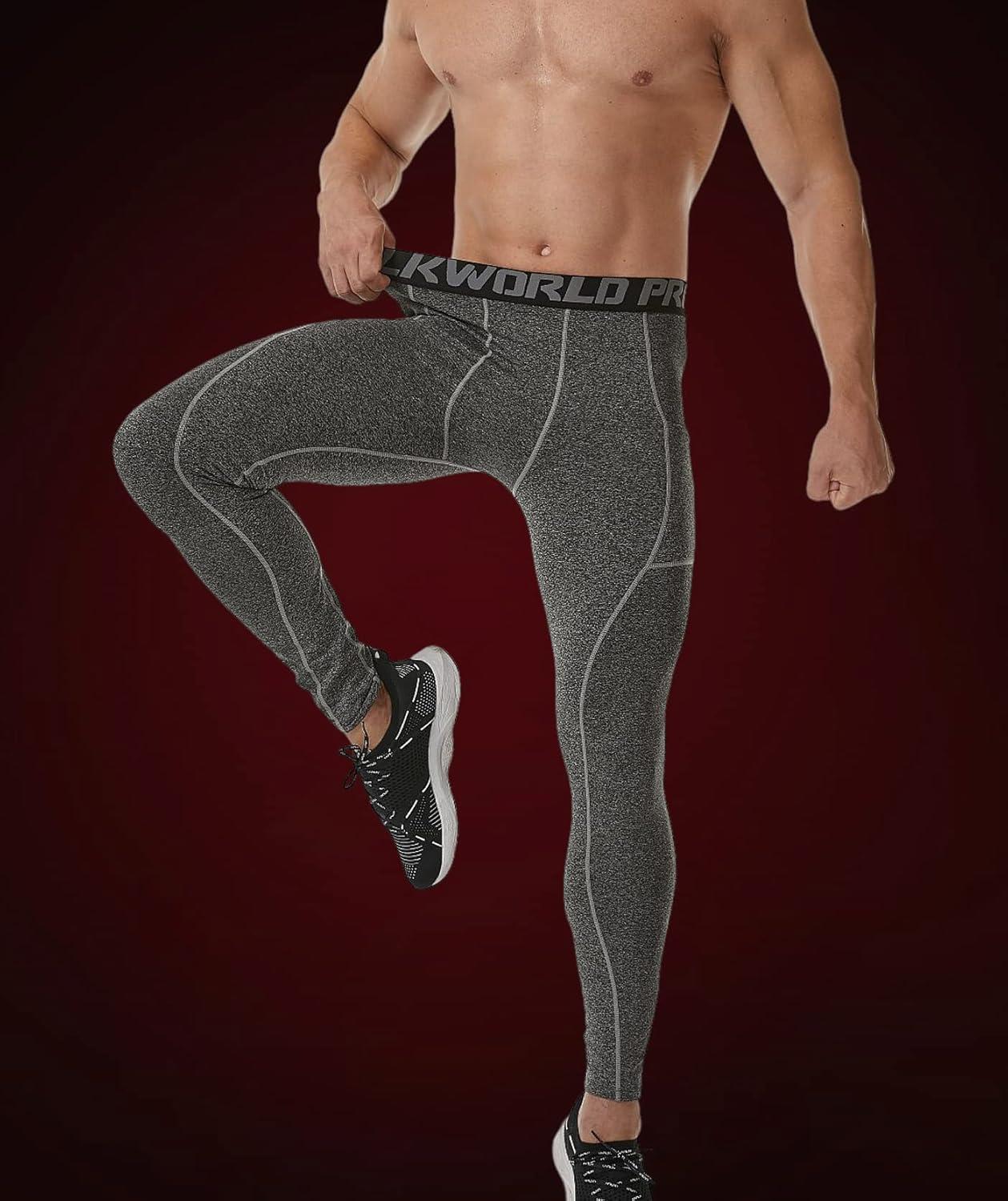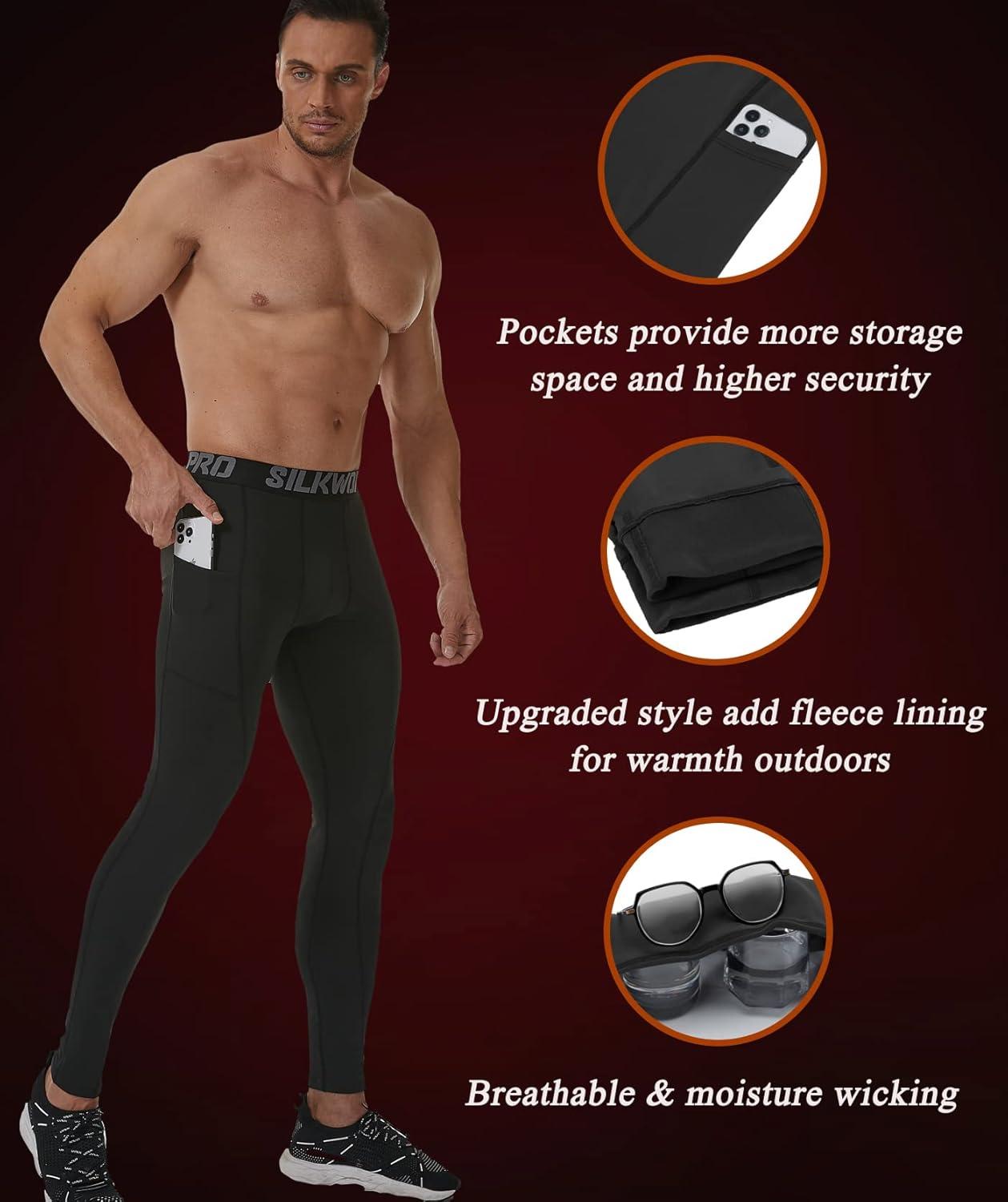 SILKWORLD Men’s 1~3 Pack Compression Pants Pockets Cool Dry Gym Leggings Baselayer Running Tights(C6_fleece Lined_3pack_black Gray White)