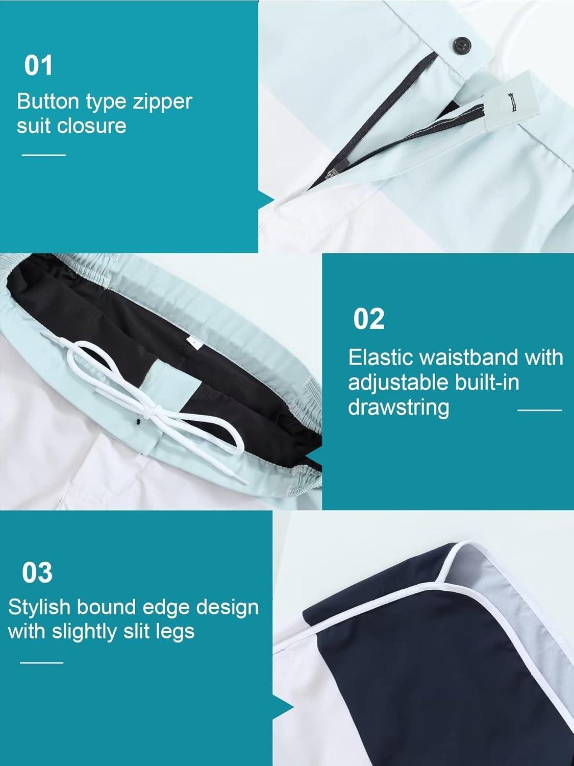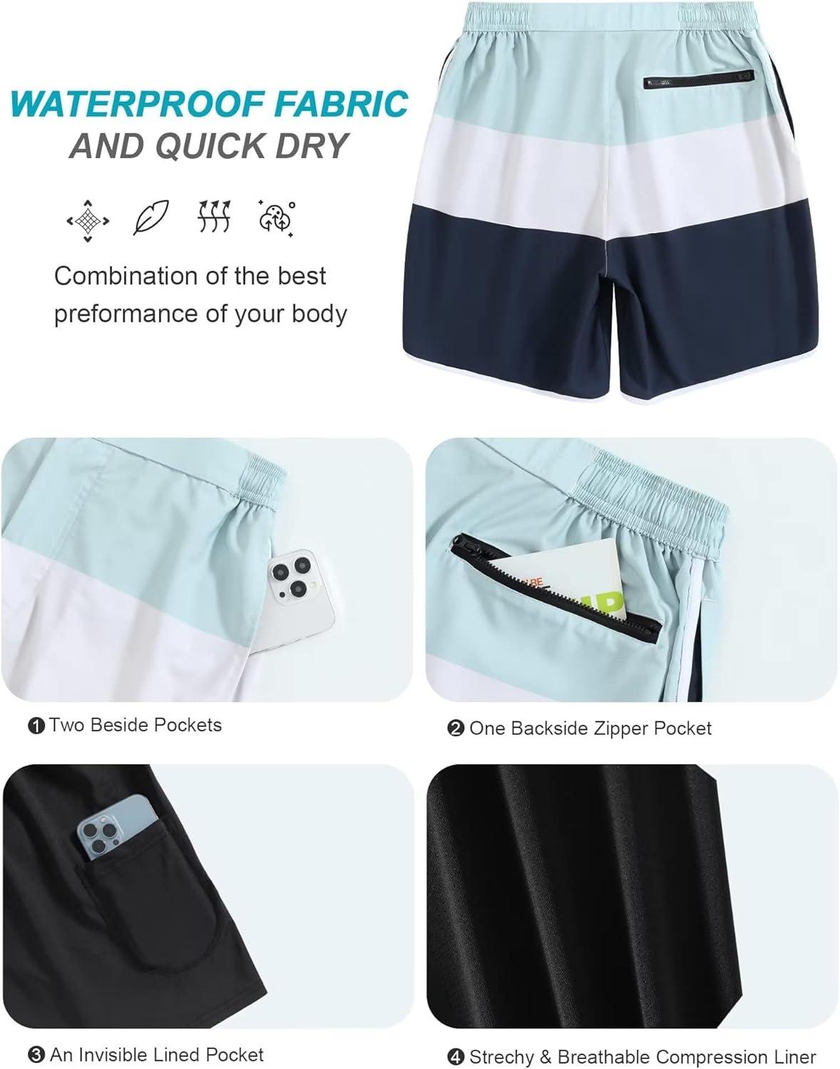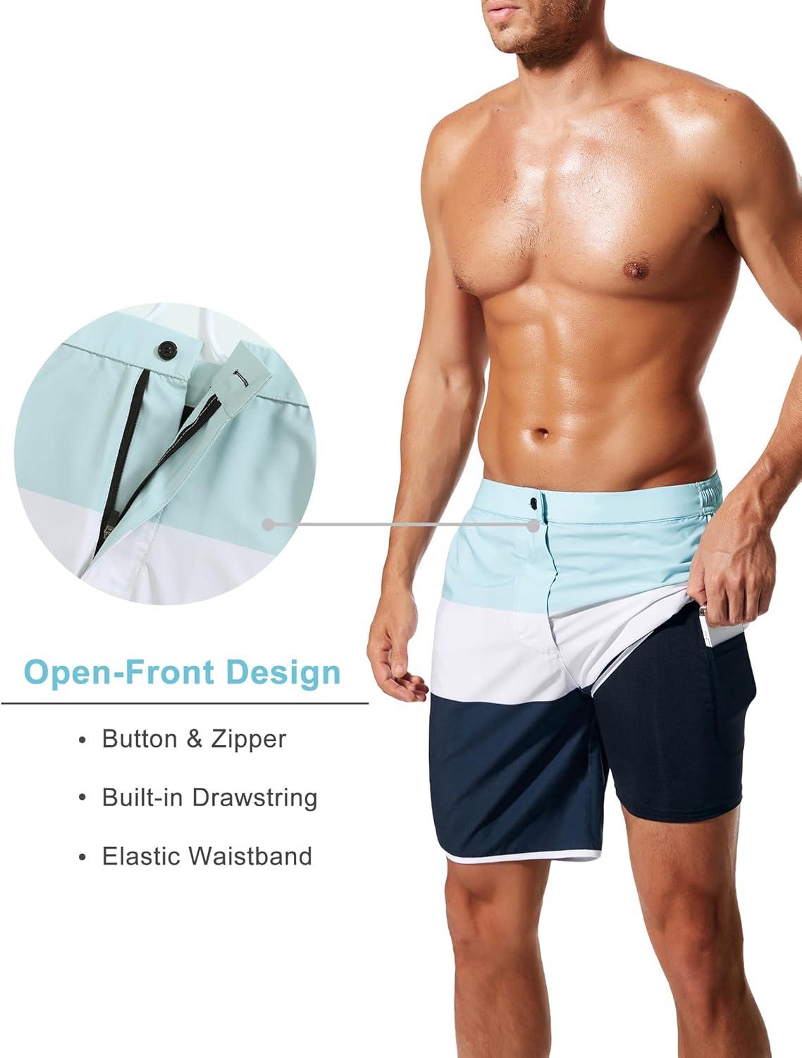 SILKWORLD Mens Swim Trunks Front Zipper Fly Quick Dry Beach Shorts with Compression Liner and Back Zipper Pockets