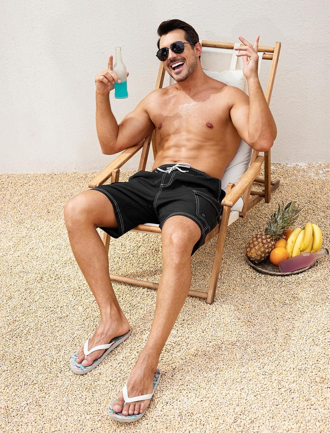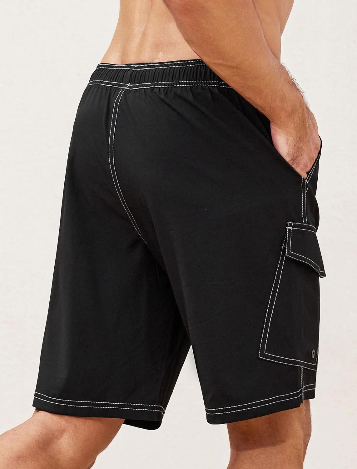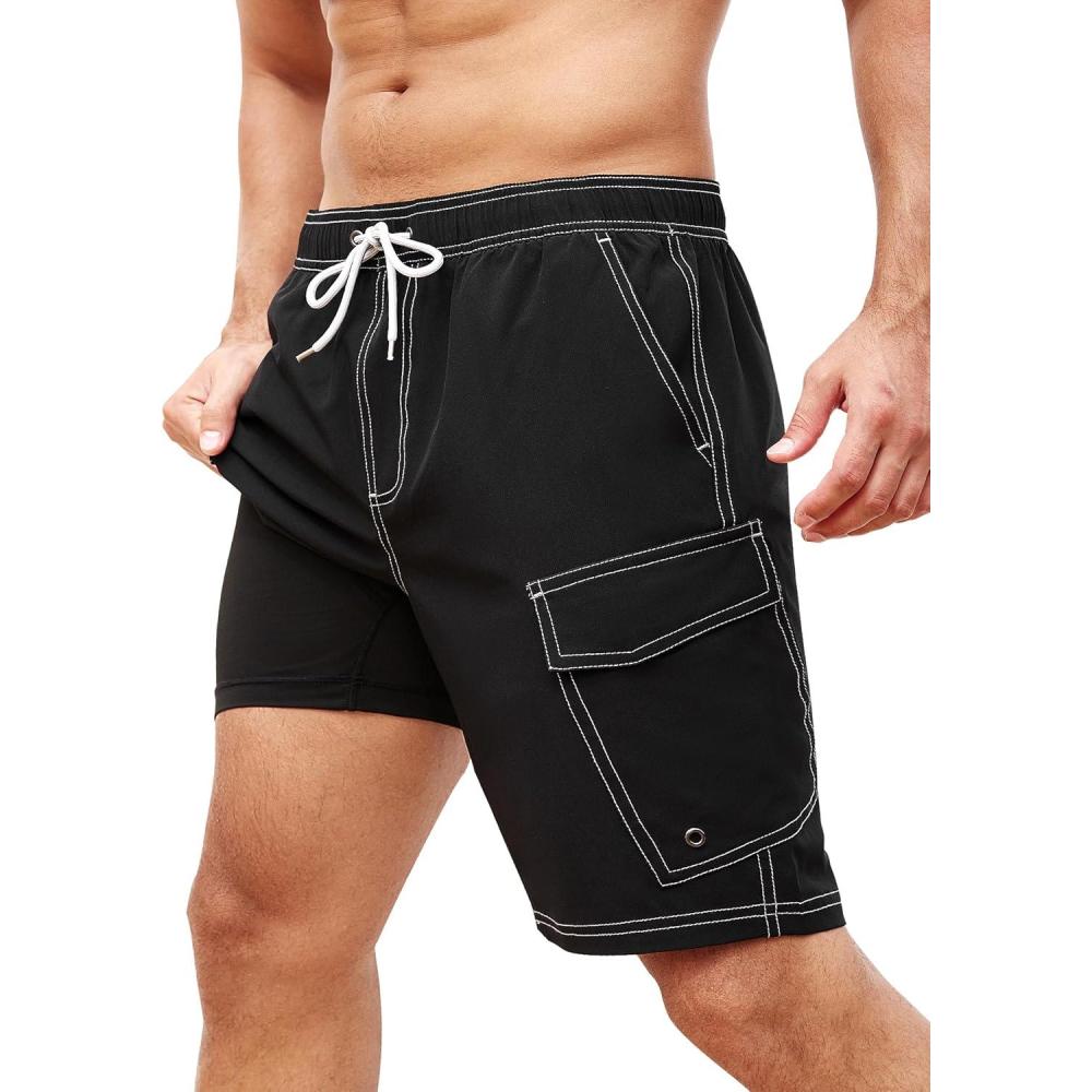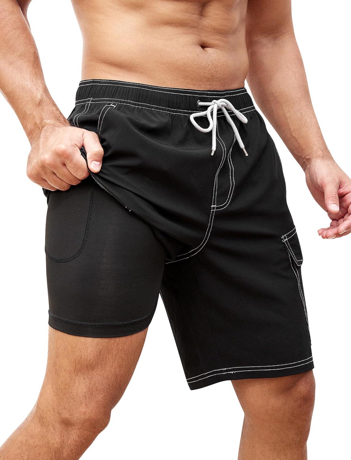 SILKWORLD Mens Swim Trunks with Compression Liner 9 Inch Bathing Suits Quick-Dry Swimming Beach Shorts with Cargo Pockets(A00 Black)