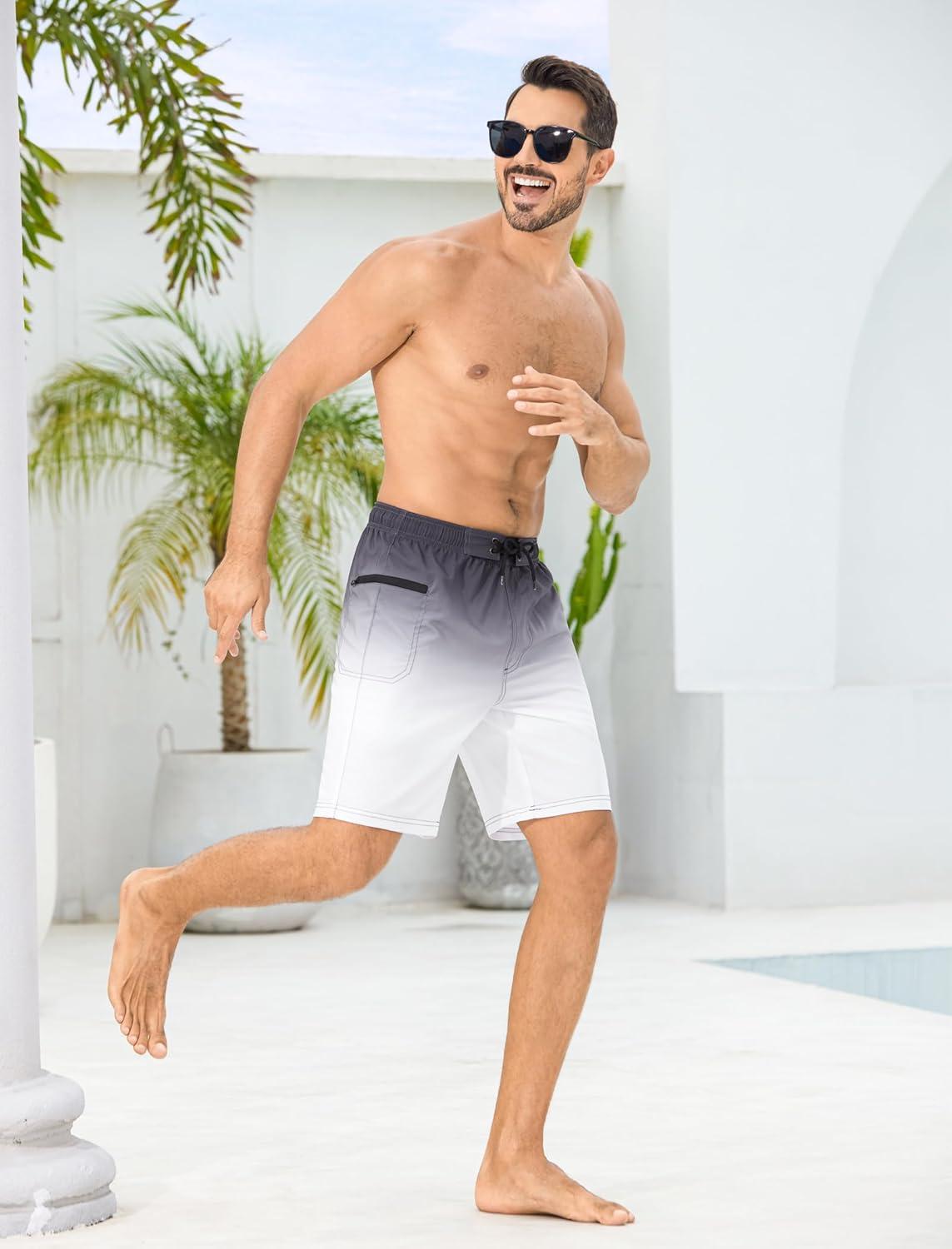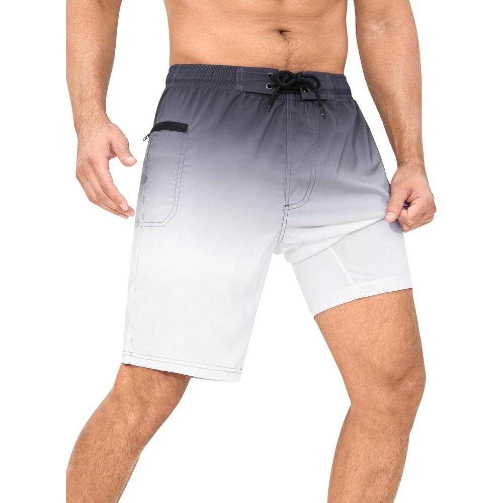SILKWORLD Men’s Swim Trunks with Compression Liner 9″ Swimming Trunk 2 in 1 Beach Quick Dry Shorts with Zipper Pocket(Black White Gradient)