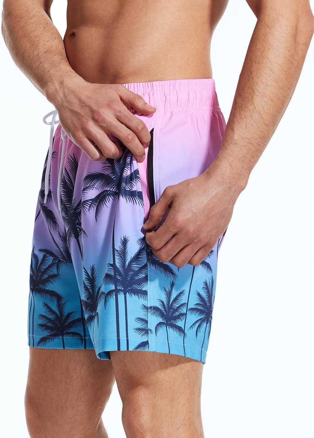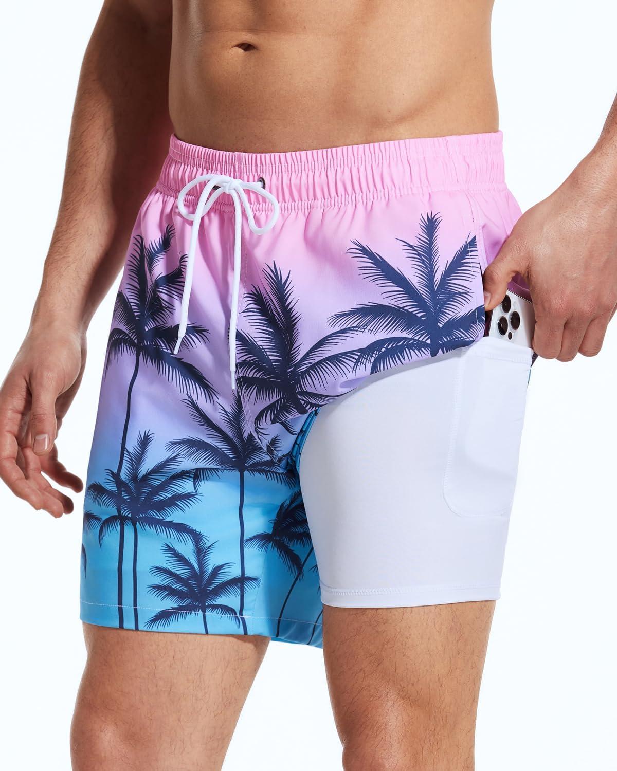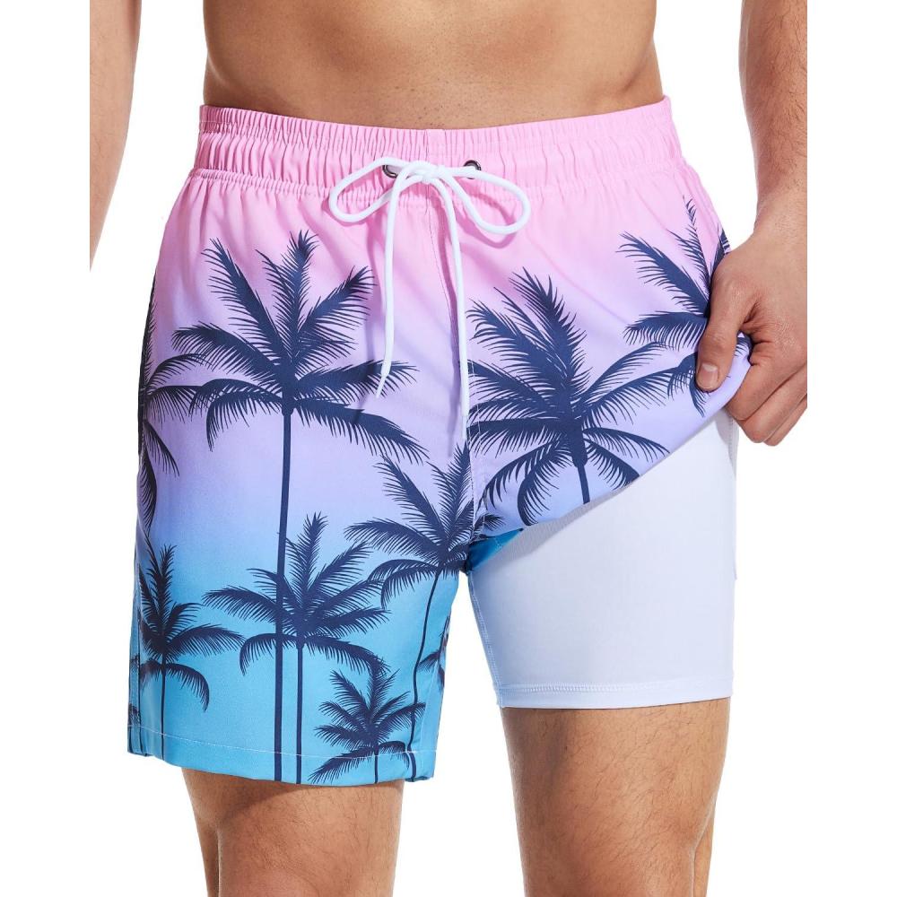 SILKWORLD Mens Swimming Trunks with Compression Liner 2 in 1 Quick-Dry Swim Shorts with Zipper Pockets(Pink Blue Coconut Tree)