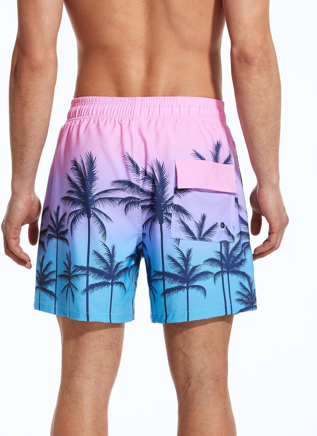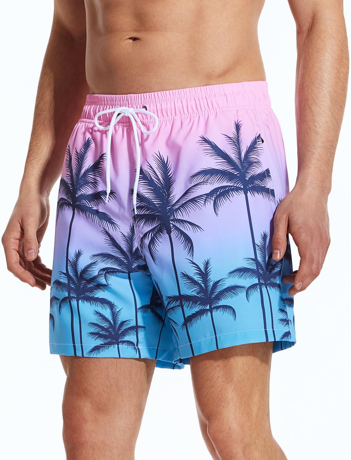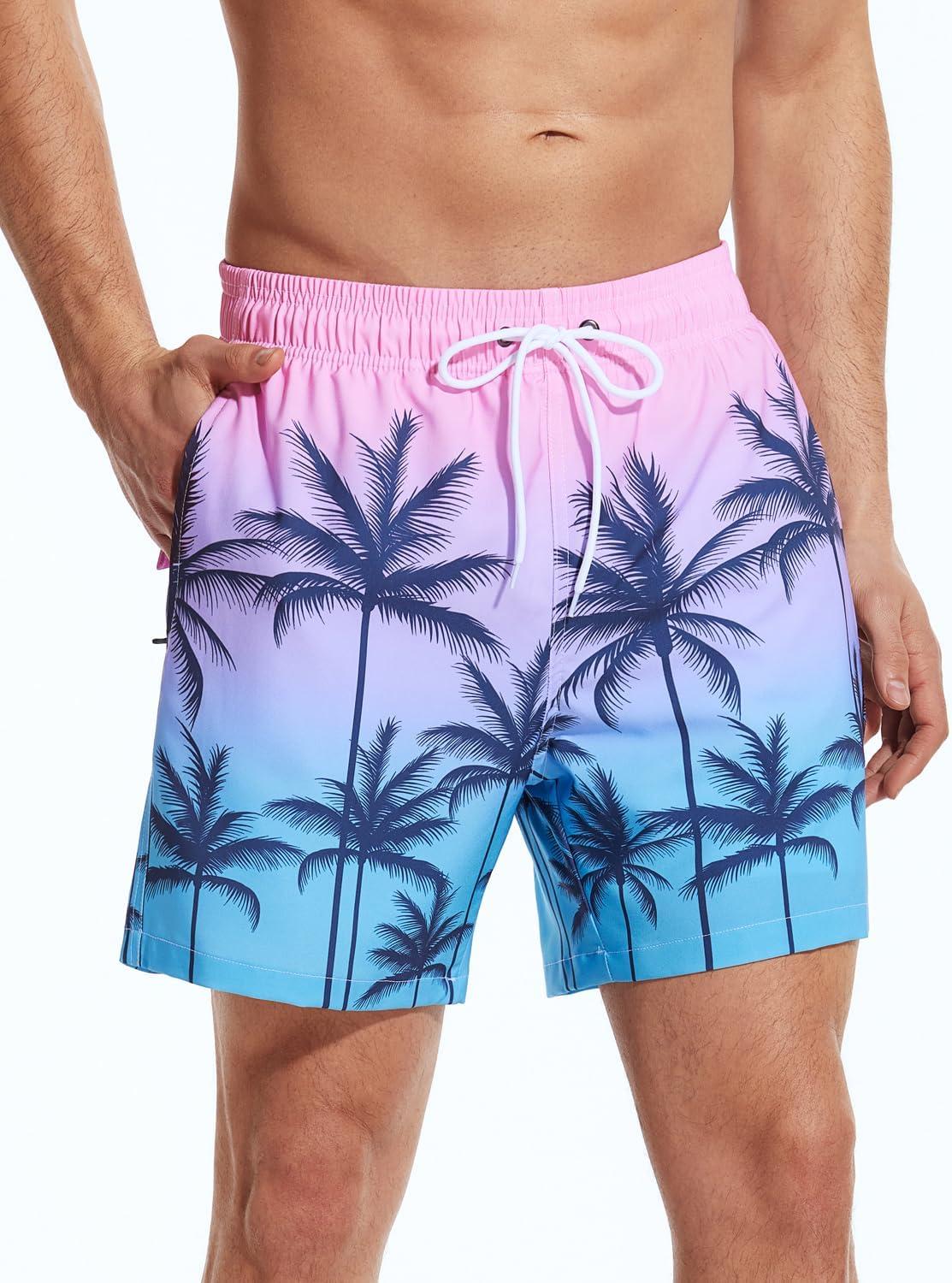 SILKWORLD Mens Swimming Trunks with Compression Liner 2 in 1 Quick-Dry Swim Shorts with Zipper Pockets(Pink Blue Coconut Tree)